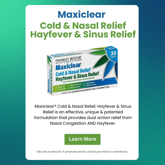 Maxiclear® Cold & Nasal Relief, Hayfever & Sinus Relief is an effective, unique & patented formulation that provides dual action relief from Nasal Congestion AND Hayfever.